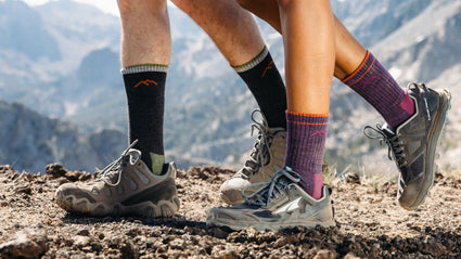 Close up on model  featureing the 1403 Men's hiker Boot sock and the Women's 1903 Micro crew hiker