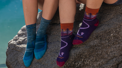 Two models feet on a rock wearing the Northwoods micro crew in nightshade and cascade light hiker