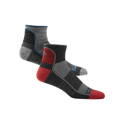 2 pack bundle shot including men's 1715 quarter athletic sock in both offered colors, charcoal and team DTV red
