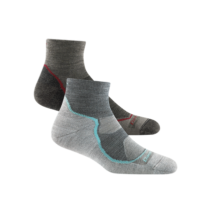 2 pack bundle shot including women's slate and men's taupe light quarter hiking sock