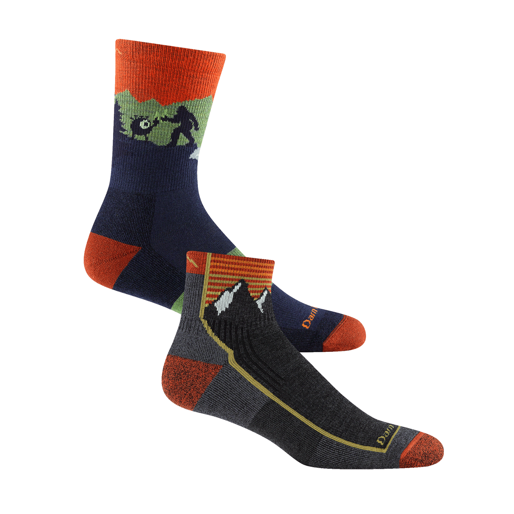 1959 quarter hiking sock in mountain gray featuring orange heel/toe, charcoal body with stripes and mountain image on cuff