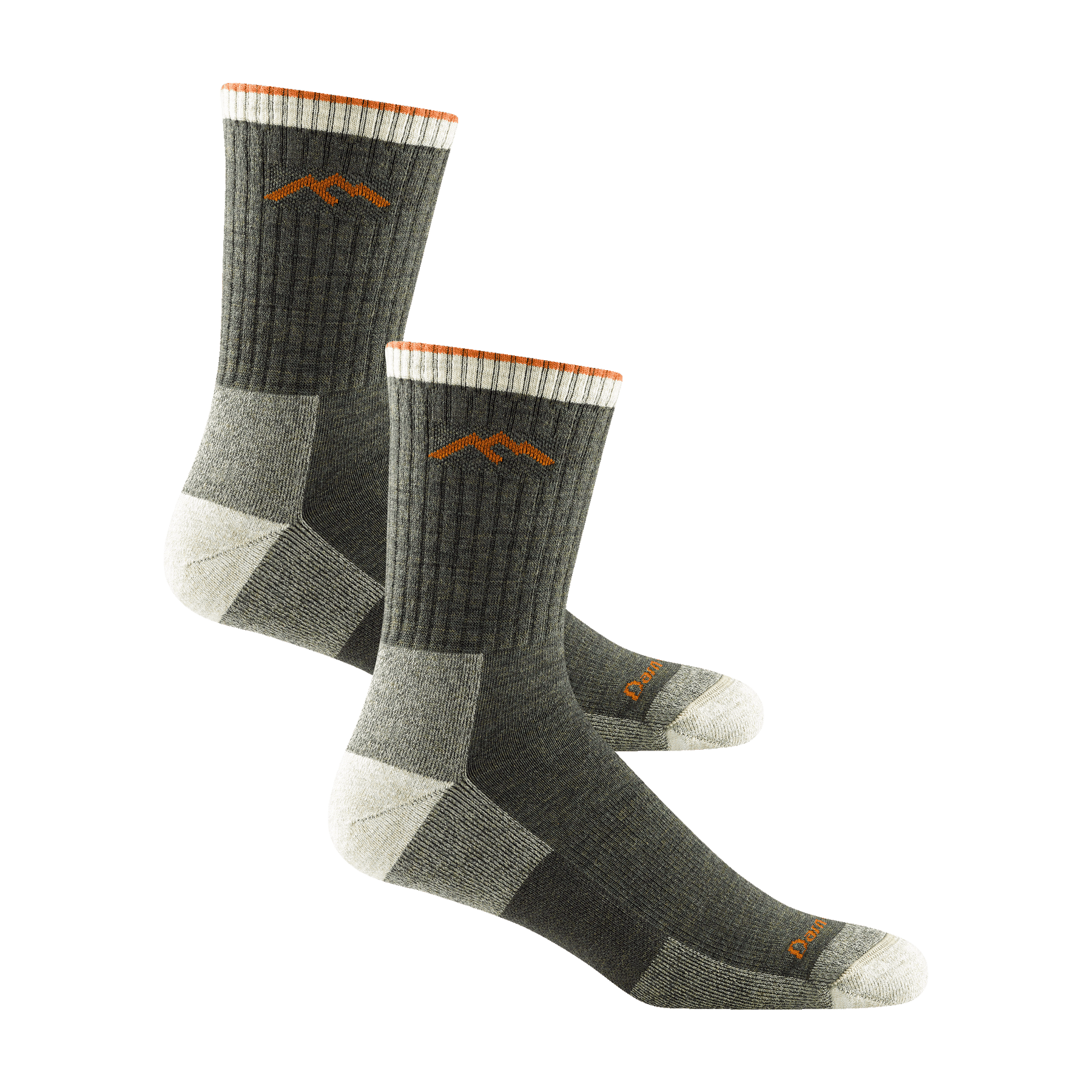 1466 men's micro crew hiking sock in olive green with white toe/heel accents and orange darn tough signature on forefoot