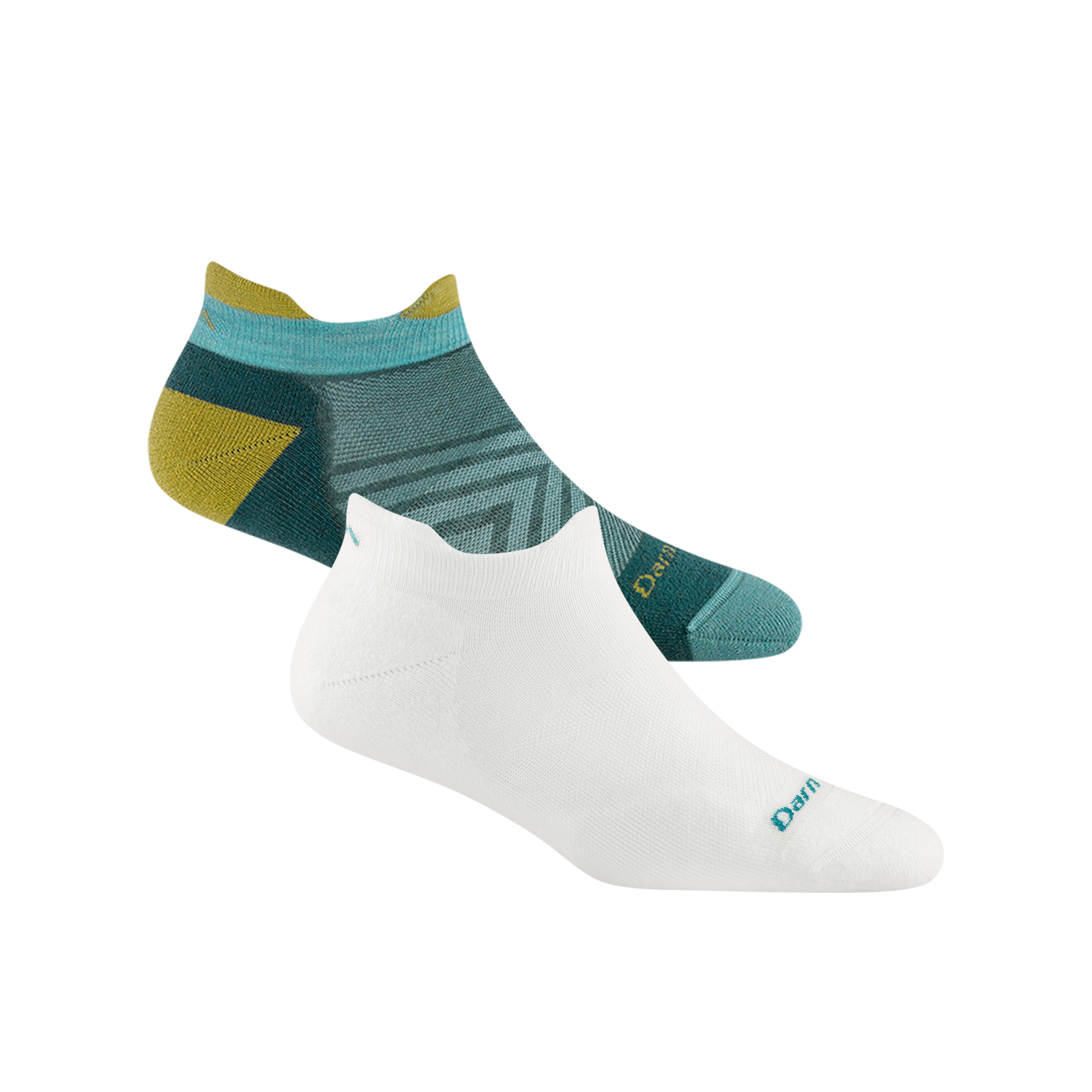 1047 women's no show tab running sock in color white with teal darn tough signature on forefoot