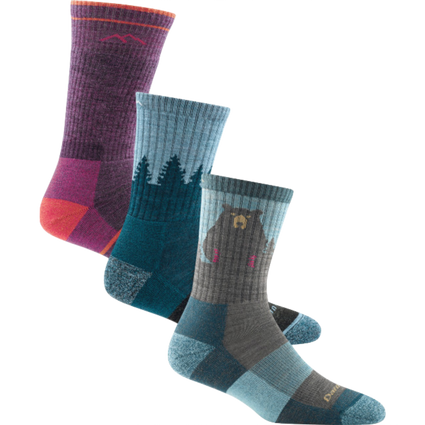 3 pack hiking bundle shot including the women's boot sock in plum heather, the women's treeline micro crew sock in blue, and the women's bear town micro crew sock in aqua